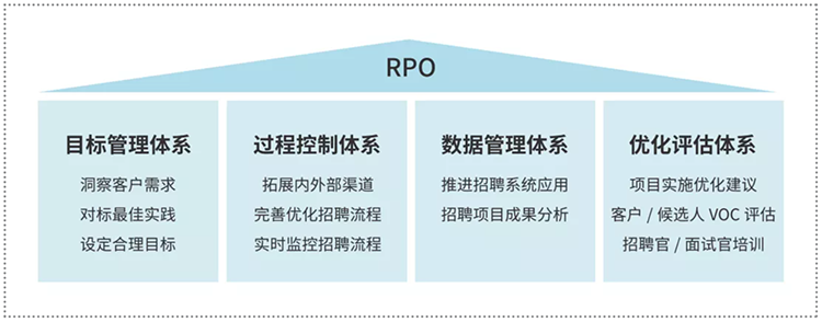 招聘流程外包属于业务流程外包的一种。具体而言,是由RPO(Recruitment Process Outsourcing)服务商作为总包商(Master Contractor),为企业给予招聘策略咨询、招聘体系搭建、招聘流程管理、人才库管理、招聘渠道管理、招聘技能培训、雇主品牌提升、招聘新技术应用等,同时确保招聘结果高效达成的整体解决方案。