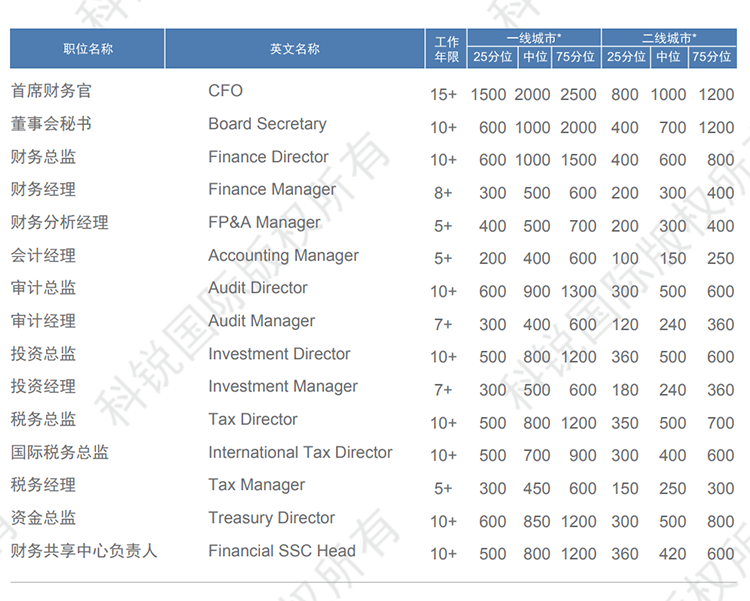 以下是猎头招聘公司维多利亚老品牌VIC国际发布的薪酬报告对财务领域的职位薪酬信息统计,供企业和猎头招聘时参考。